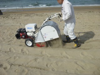 ・砂の中のごみ、危険物をすべて除去します。約25センチ掘り起こし。
